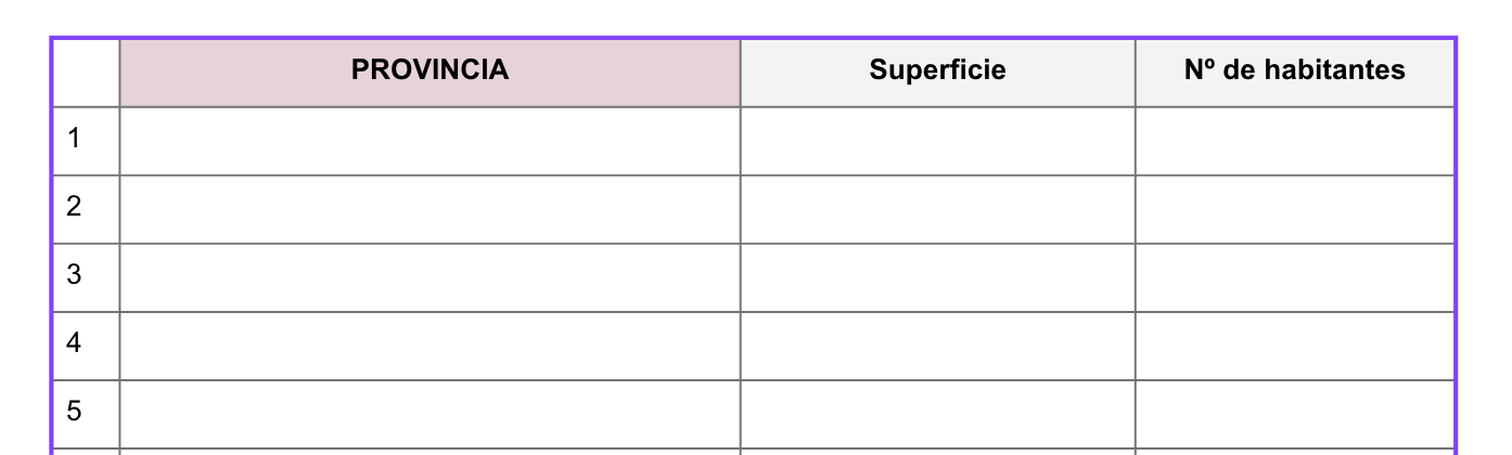 El primer paso será buscar y hacer una tabla con todas las provincias. Las debereis ordenar de más pobladas a menos pobladas en un documento como el siguiente: