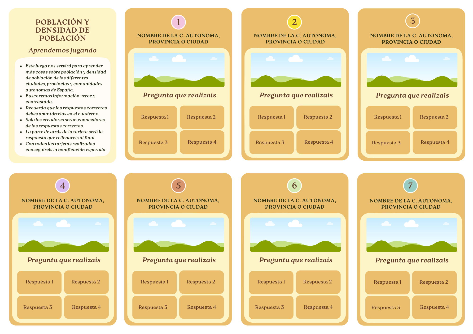 Para ello solo debéis crear 15 preguntas relacionadas con los climas y paisajes de España, es decir, todo lo aprendido en esta etapa. Se presentarán con forma de carta donde deben aparecer la pregunta y cuatro opciones a elegir (entre las cuales se marcará la correcta) y se entregarán a vuestro profesor o profesora. La plantilla la podreis encontrar en CANVA. Una vez acabado deberéis enviarlo a vuestro profesor o profesora mediante el botón de "enviar al docente".