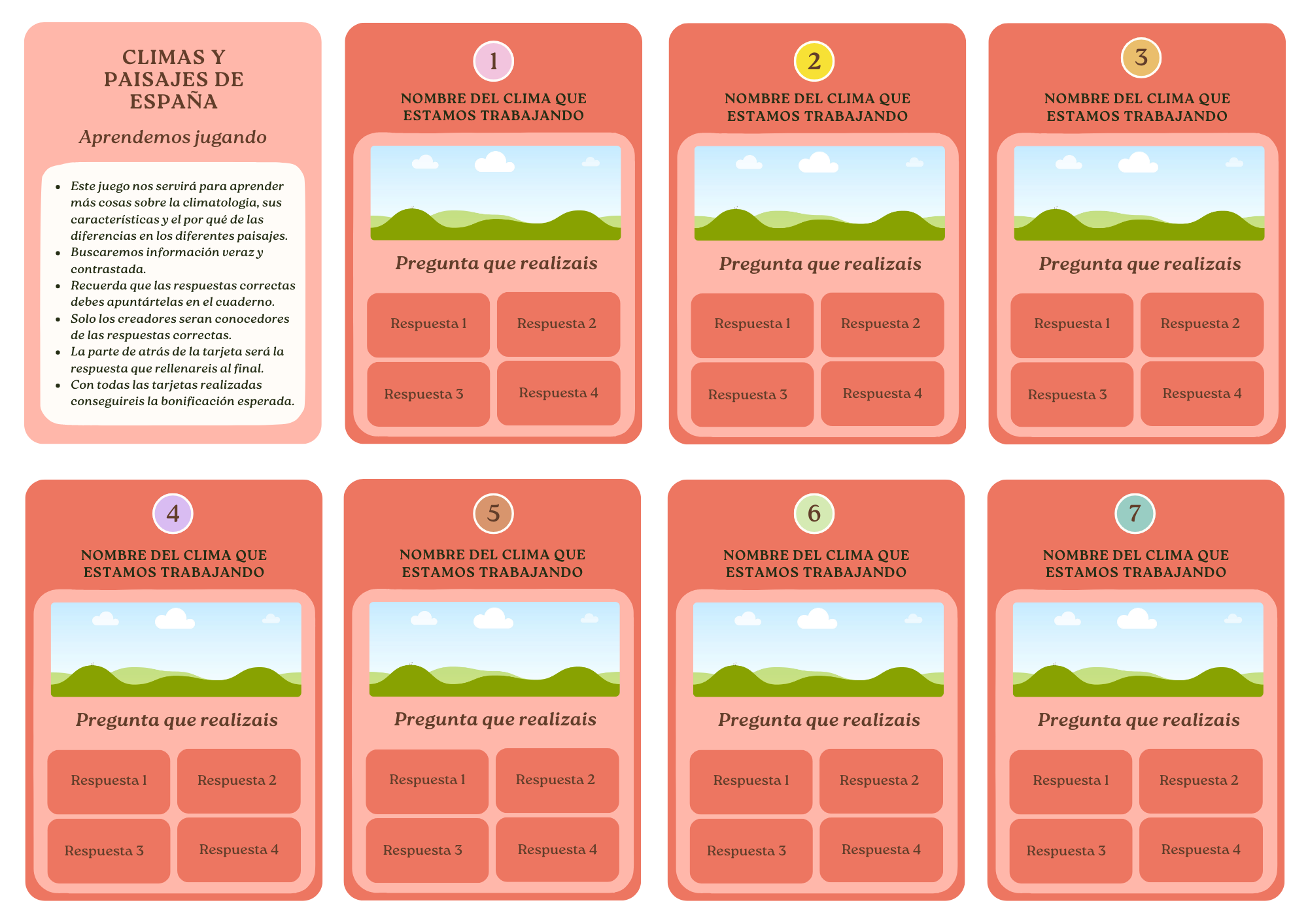 Para ello solo debéis crear 15 preguntas relacionadas con los climas y paisajes de España, es decir, todo lo aprendido en esta etapa. Se presentarán con forma de carta donde deben aparecer la pregunta y cuatro opciones a elegir (entre las cuales se marcará la correcta) y se entregarán a vuestro profesor o profesora. La plantilla la podreis encontrar en CANVA. Una vez acabado deberéis enviarlo a vuestro profesor o profesora mediante el botón de "enviar al docente".